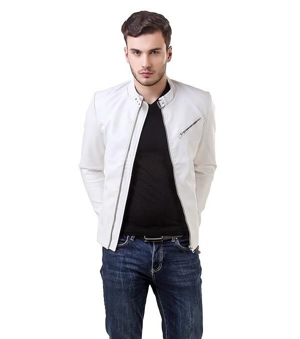Leather Retail Faux Leather Men's White Solid Biker Jacket
