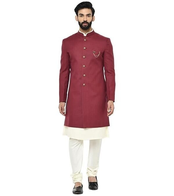KISAH Men Maroon Solid Kurta Indo-Western Sherwani Set Indo-Western, Full Sleaves, Knee Length, Straight, Regular Fit, Mandarin Collar Ethnic wear