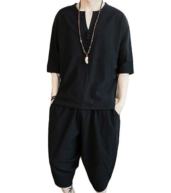 foveitaa Summer Clothing Men's Loungewear, Japanese Clothes, T-shirt, 3/4 Sleeves, Hemp Shirt, Short Sleeve, Top and Bottom Set, Top, Half Pants, Shorts, Top and Bottom